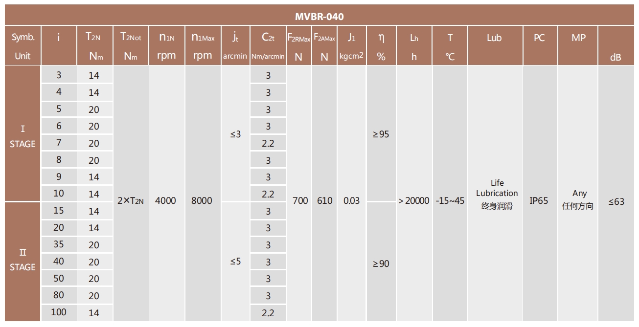 MVBR-040-L1系列超精密背隙行星減速機系列(P0): MVBR-040-L1系列精密背隙行星減速器系列(P1): MVBR-040-L1系列標準背隙行星減速機系列(P2):