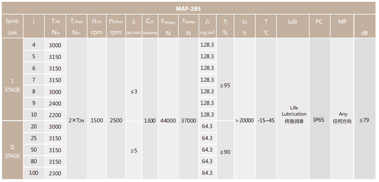 MAF-285-L1系列超精密背隙行星減速機系列(P0): MAF-285-L1系列精密背隙行星減速器系列(P1): MAF-285-L1系列標準背隙行星減速機系列(P2):